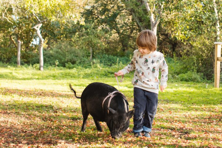 Your pig walk will last around 20 minutes before the pigs go home for a drink and a rest. Your experience will take place at some point during our 2-hour session, but not necessarily as soon as you arrive. You’re welcome to stay for the rest of the session to mingle with our other animals in the orchard.